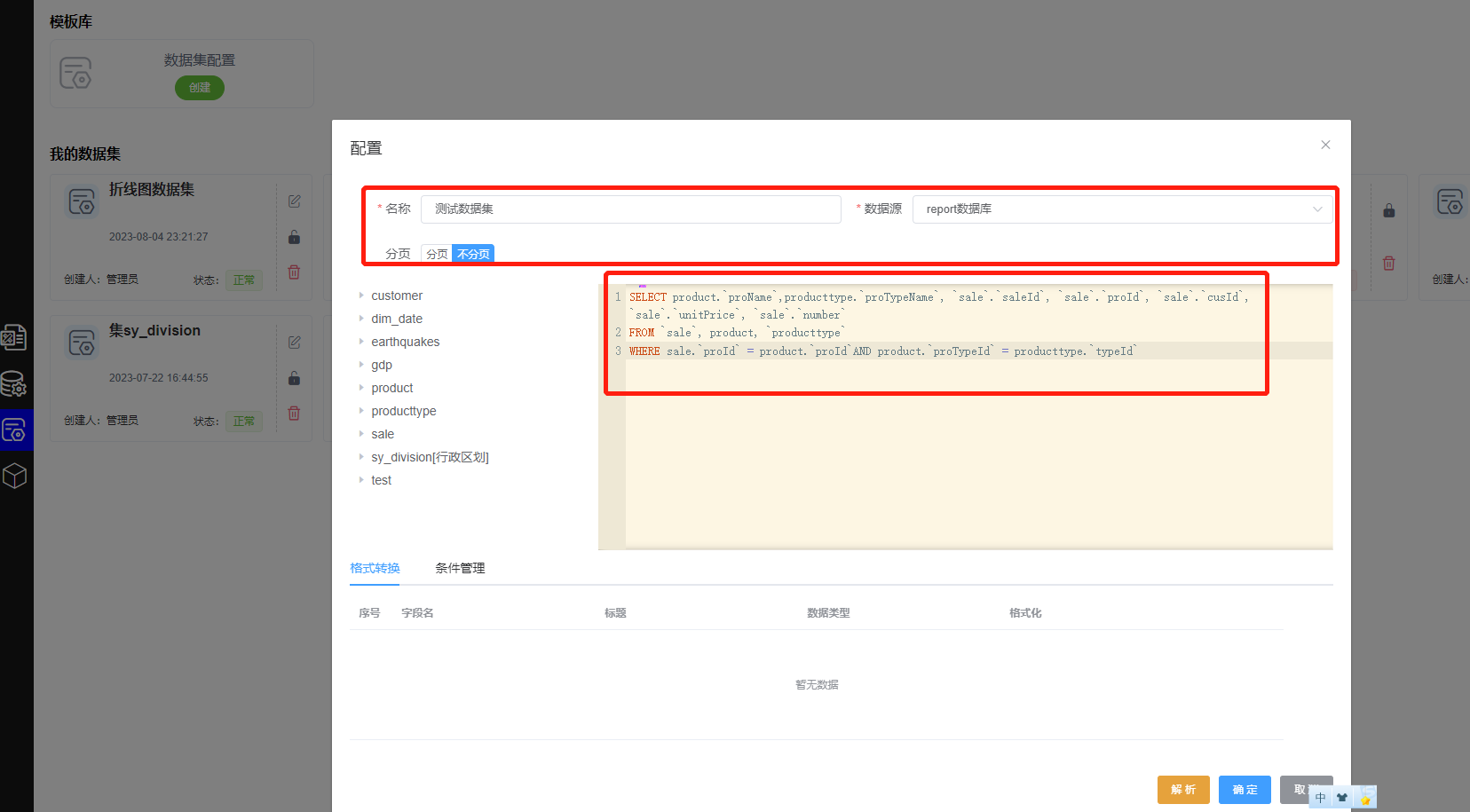 输入数据集的必填信息,名称、选择数据源、是否分页。再输入sql语句