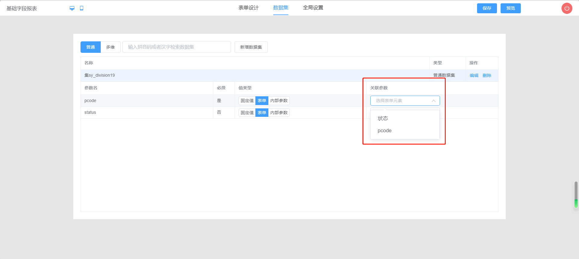 前面数据集“集sy_division19”在条件管理里面设置了2个条件,一个是pcode,一个是status,在设计器选择数据集的时候,选中这个数据集,可以看到此数据集有2 个参数,一个是pcode,一个是status
